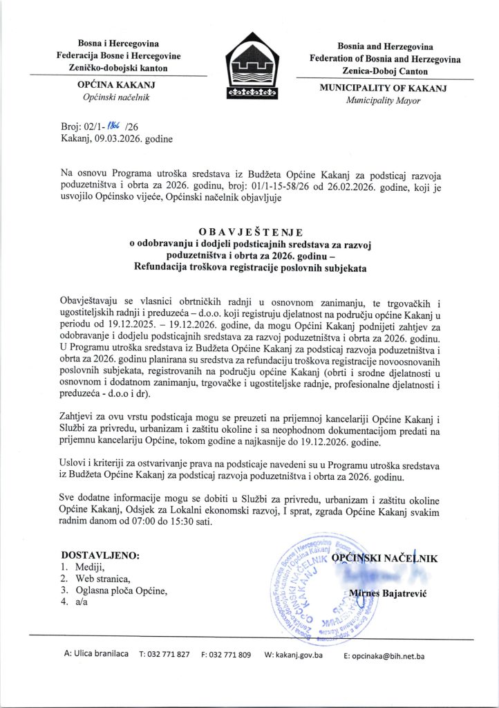 Ova mjera odnosi se na sve koji registruju djelatnost na području Kaknja u periodu od 19. decembra 2025. do 19. decembra 2026. godine. Nakon što završe proces registracije, poduzetnici imaju pravo podnijeti zahtjev za refundaciju troškova, čime se početno ulaganje značajno smanjuje ili praktično u potpunosti eliminiše.