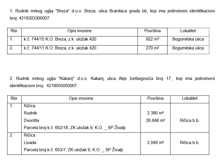 Prodaja imovine Rudnika mrkog uglja “Breza” počet će u 9 sati, dok je termin za Rudnik mrkog uglja “Kakanj” zakazan u 10 sati.