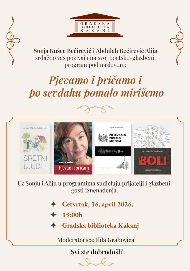 JU Gradska biblioteka Kakanj najavila je večer posvećenu poeziji i sevdahu, događaj koji će okupiti ljubitelje književnosti i tradicionalne muzike u jedinstvenom ambijentu biblioteke. Gostovanje zagrebačkih autora Sonje Kušec Bećirević i Alije Bećirevića donosi susret dvije kulturne sredine povezane zajedničkim senzibilitetom i umjetničkim izrazom.